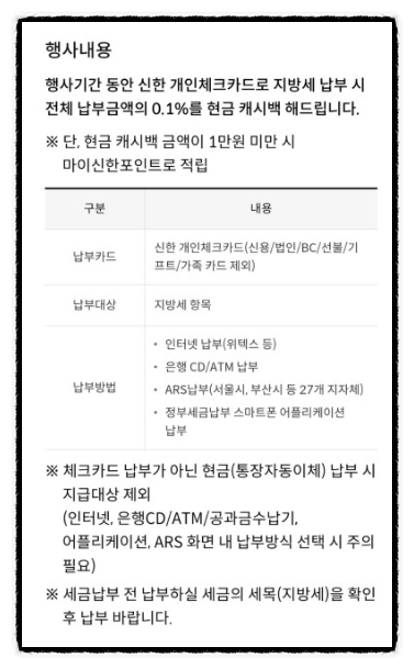 신한카드는 체크카드만 가능한데 별로 혜택이 좋진 않습니다. 0.1% 캐시백 혜택 입니다. 캐시백은 2월 7일에 지급됩니다.